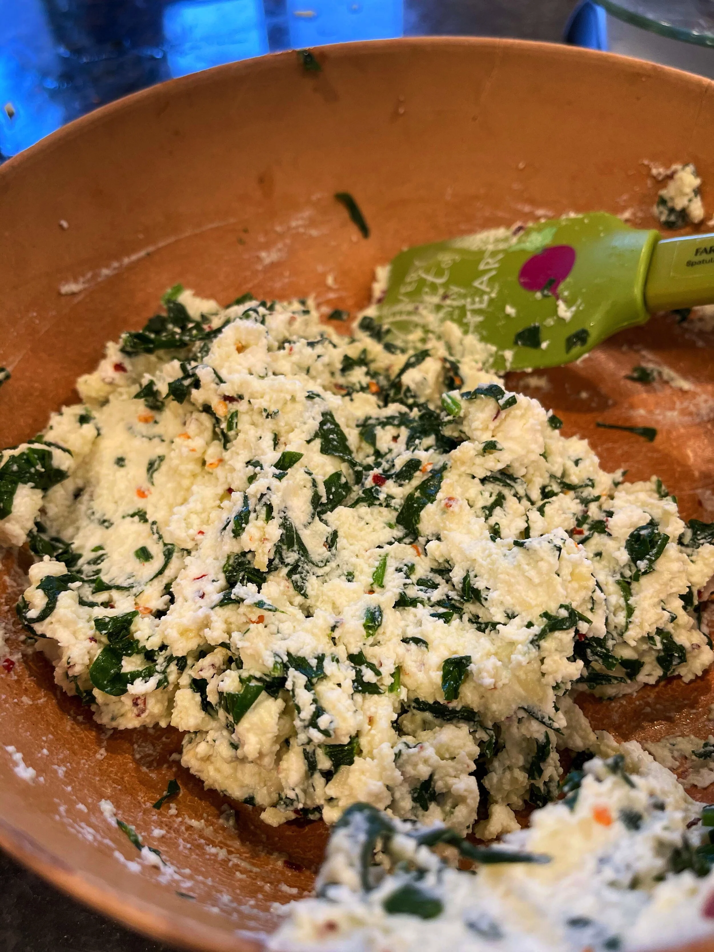 Mix & once cooled, add to ziploc or piping bag. Store in fridge while making ravioli dough.