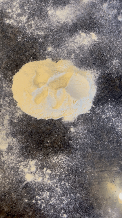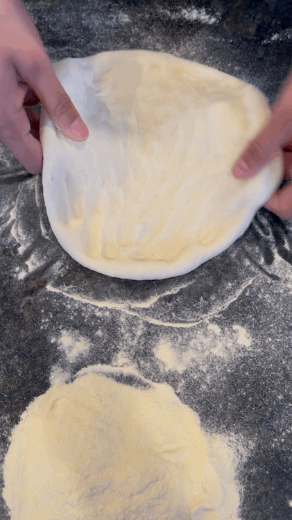 Carefully dunk the dough in semolina flour (both sides) to make sure the dough doesn’t stick to the surface.