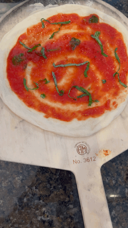 Lightly add the sauce, fresh chiffonade basil, fresh mozzarella, and then toppings.